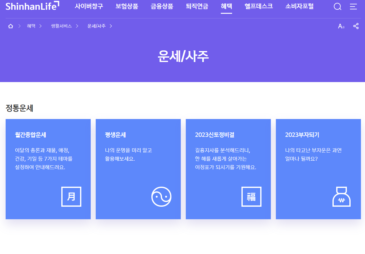 아래 사이트는 신한라이프 사이트로 무료로 운세 월별 운세등 여러 가지를 볼 수 있습니다.